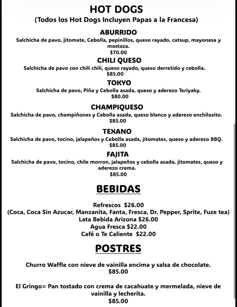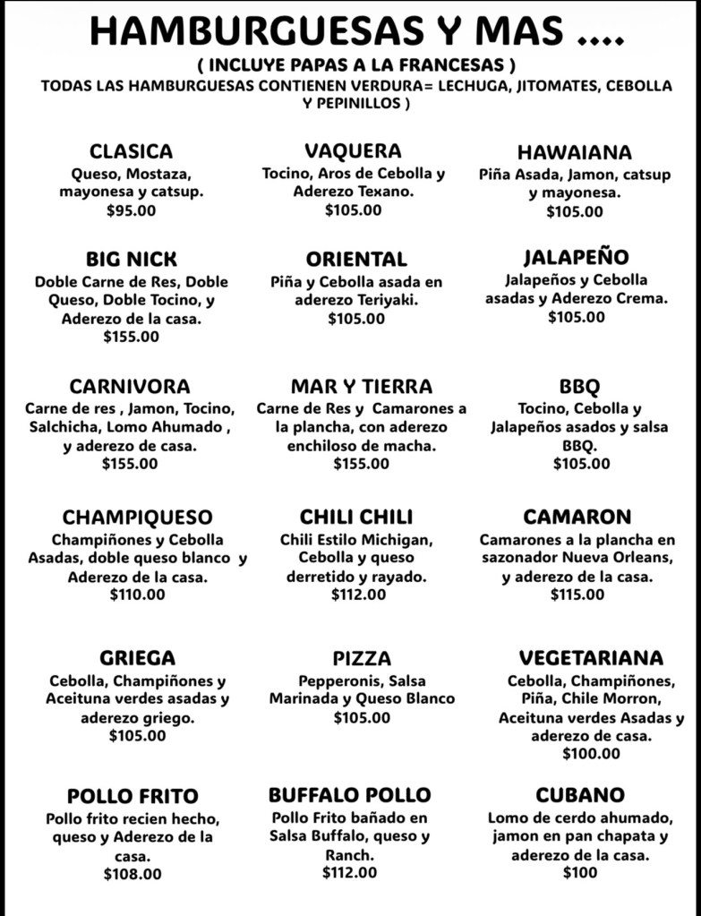 Carne de hamburguesa, Jamón, Tocino, Salchicha, queso, catsup y mayonesa.