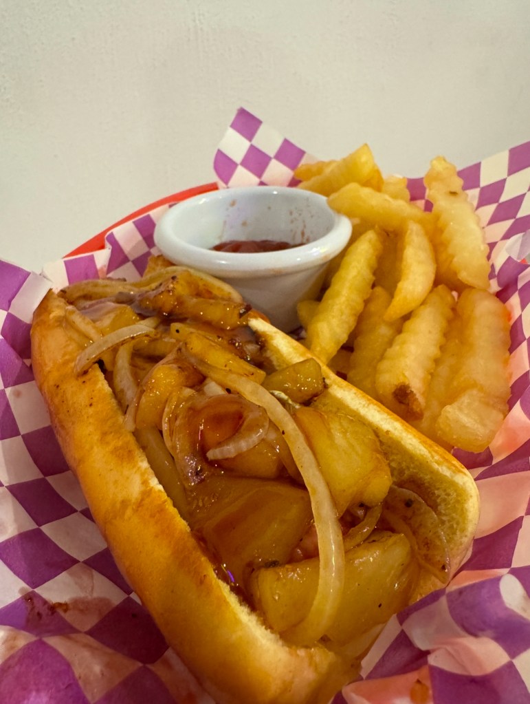 Queso, Piña y cebolla Asada con aderezo teriyaki.