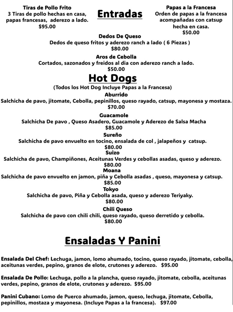 Carne de hamburguesa, Jamón, Tocino, Salchicha, queso, catsup y mayonesa.