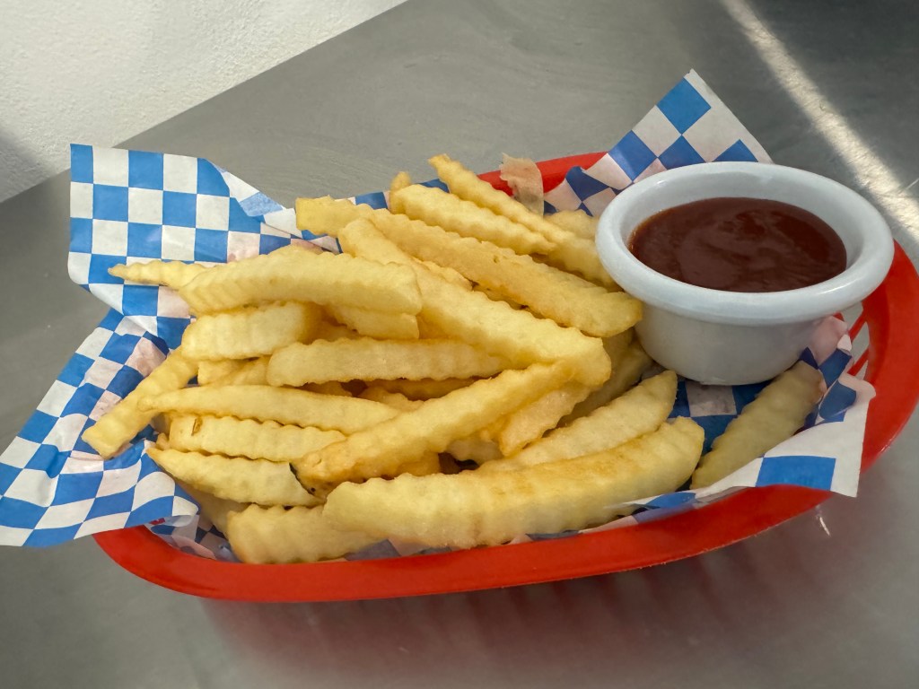 Costillas de puerco ahumadas y bañadas en salsa chipotle bbq hecha en casa, papas a la francesa y macarrones con queso a lado.