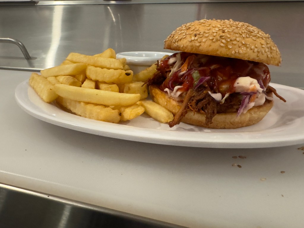 Sandwich de Carne de puerco ahumada y deshebrada bañada con salsa chipotle bbq, ensalada de col.